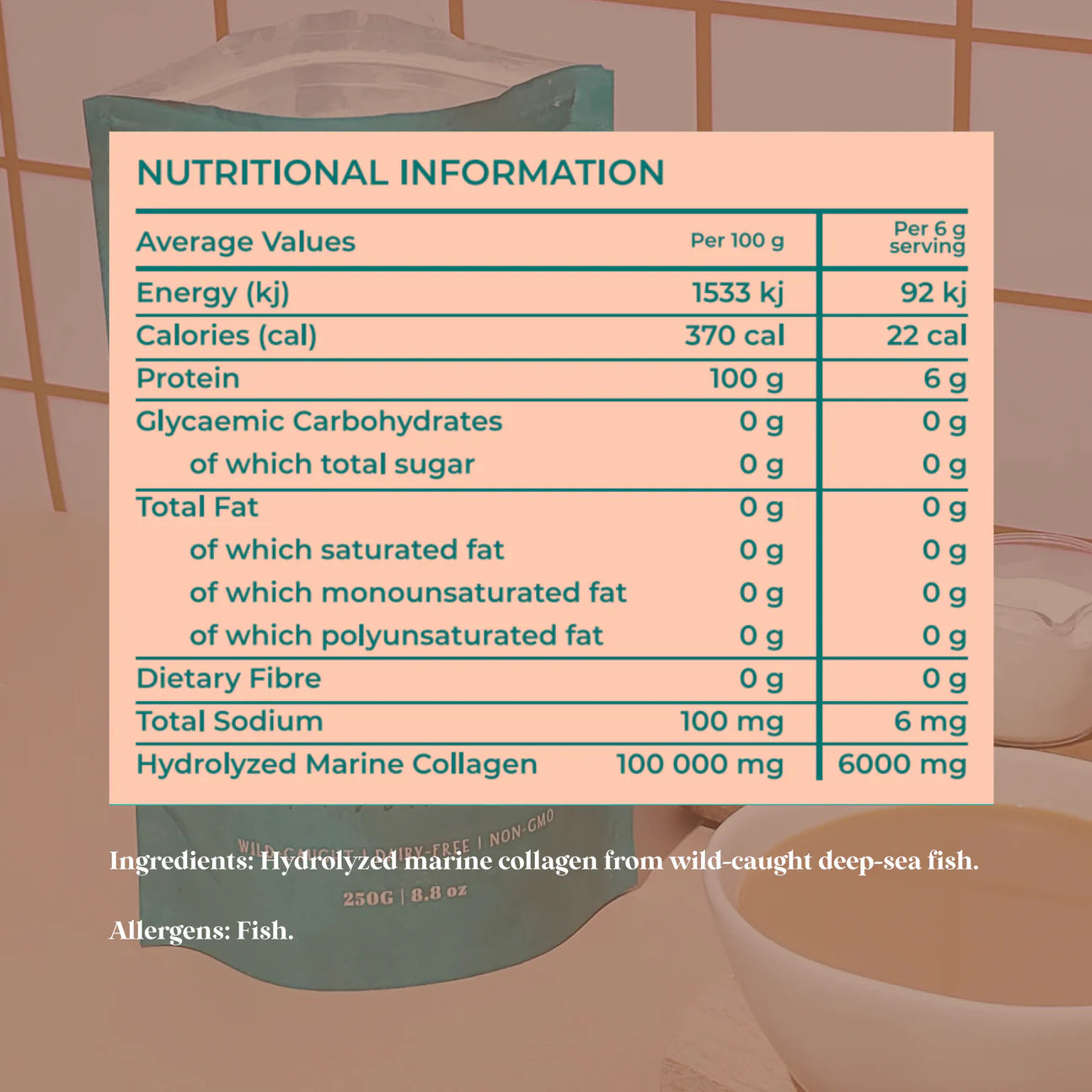 Ingredients: Hydrolyzed marine collagen from wild-caught deep-sea fish.